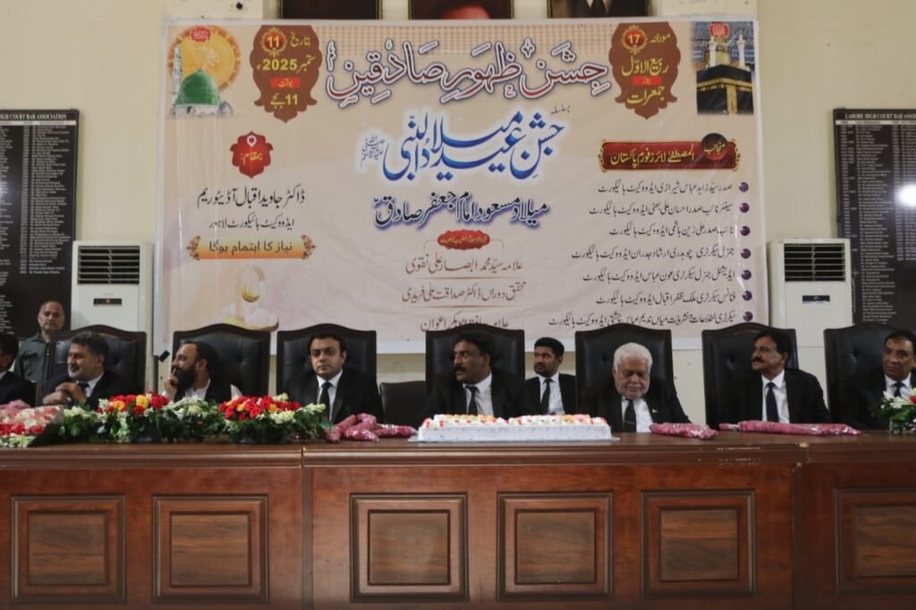 “The special participation of Mr. Farrukh Ilyas Cheema, Secretary of the Lahore High Court Bar Association, in the spiritual gathering of Eid Milad-un-Nabi (peace be upon him) and Milad-e-Masood Imam Jafar Sadiq (peace be upon him) organized by Al Mustafa Lawyers Forum, enhanced the beauty of the stage and the splendor of the gathering.”